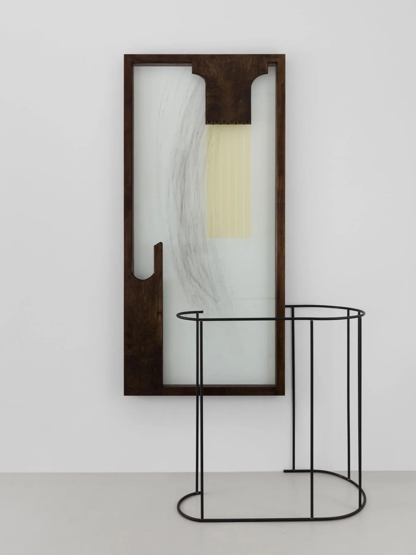 This exhibition brings together a group of recent and unseen sculptures made with craftspeople in Ireland. These sculptural works consist of recognizable materials such as wood and stone that partly adheres to their conventional use within furniture and architecture but, in each case, highlights their new absoluteness. For example, in Shelf (held), 2023 displayed for the first time in this exhibition, glass wood and steel are used as tools to frame, fragment or obscure from view. These materials are placed together in a fragile composition that remains poised and deliberate, despite its tension.