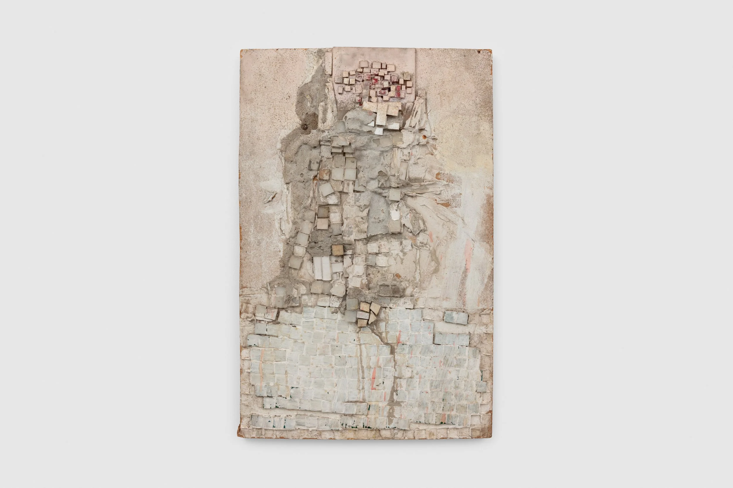 Unlike historical mosaics, which are characterised by their even surface, Denny has built up the surface with the pieces, devising a sculptural assemblage of an image. With his process of addition and removal of the material, his own discovery of losing and finding the structure within the work as it unfolds becomes clear, yielding a tension that oscillates between stability and collapse. Layers are built up and then excavated again to reveal a face or a landscape. Working rigorously to disrupt the repetition of the mosaic square, with plaster, concrete, and resin, Denny achieves an organic and dense, undulating surface; where, as in late Cubist paintings, he renders the subject, the architecture, and the space in-between all as concrete matter.