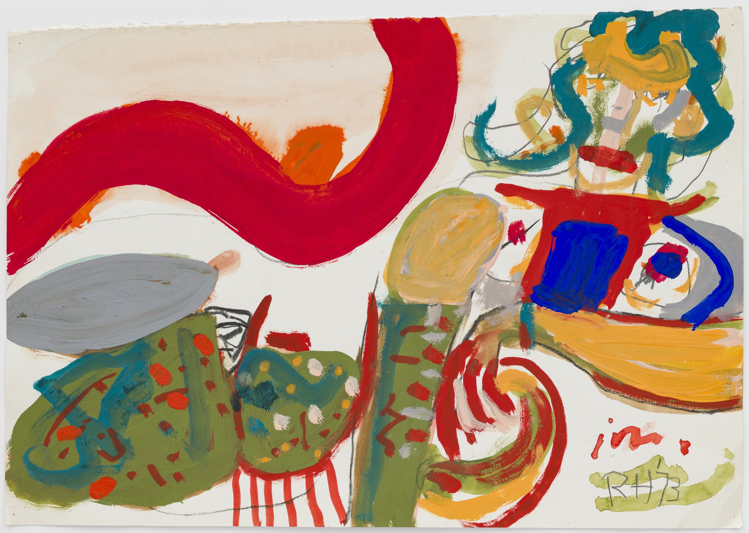 Fifty years ago, in 1975, Roger Hilton, one of the pioneering British artists of the 20th Century, died of a stroke aged 64 near St Ives. The artist had been confined to his bed in Cornwall due to severe illness since 1973, and was slowly losing the use of his arms and legs. He started to play with the poster paints given to his son at Christmas 1972, and what resulted is a series of electric and explicit gouaches exploring art, sex, life, and death. Animals, birds, nudes, and boats are expressed with apparent abandon but with great control. Hilton, who was a Prisoner of War for three years from 1942, was a painter previously versed in abstraction, yet this exhibition shows his exploration of raw figuration in his final days. The series of gouaches only ended with Hilton’s death in February 1975. Vardaxoglou is pleased to present a group of previously unseen gouaches from this period from the Estate of Roger Hilton. The paintings Hilton produced in this period show the artist’s determination to make art in the face of imminent death.